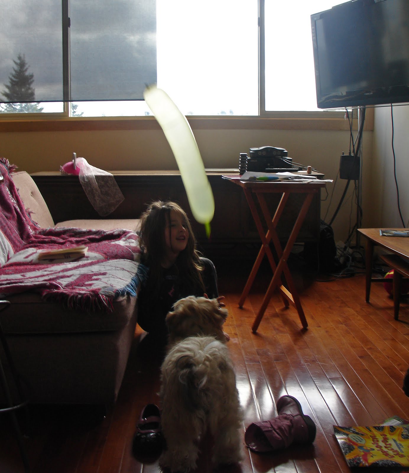 BTW, though Endeavour was foiled, Annabelle had her own launch of sorts. She was playing with a blast-off balloon, which rocketed all 'round the house when she let go of it. Its motion and sound were probably enough to entice Kirby, but to make the balloon even more enticing, Annabelle taped a doggie treat to its end!