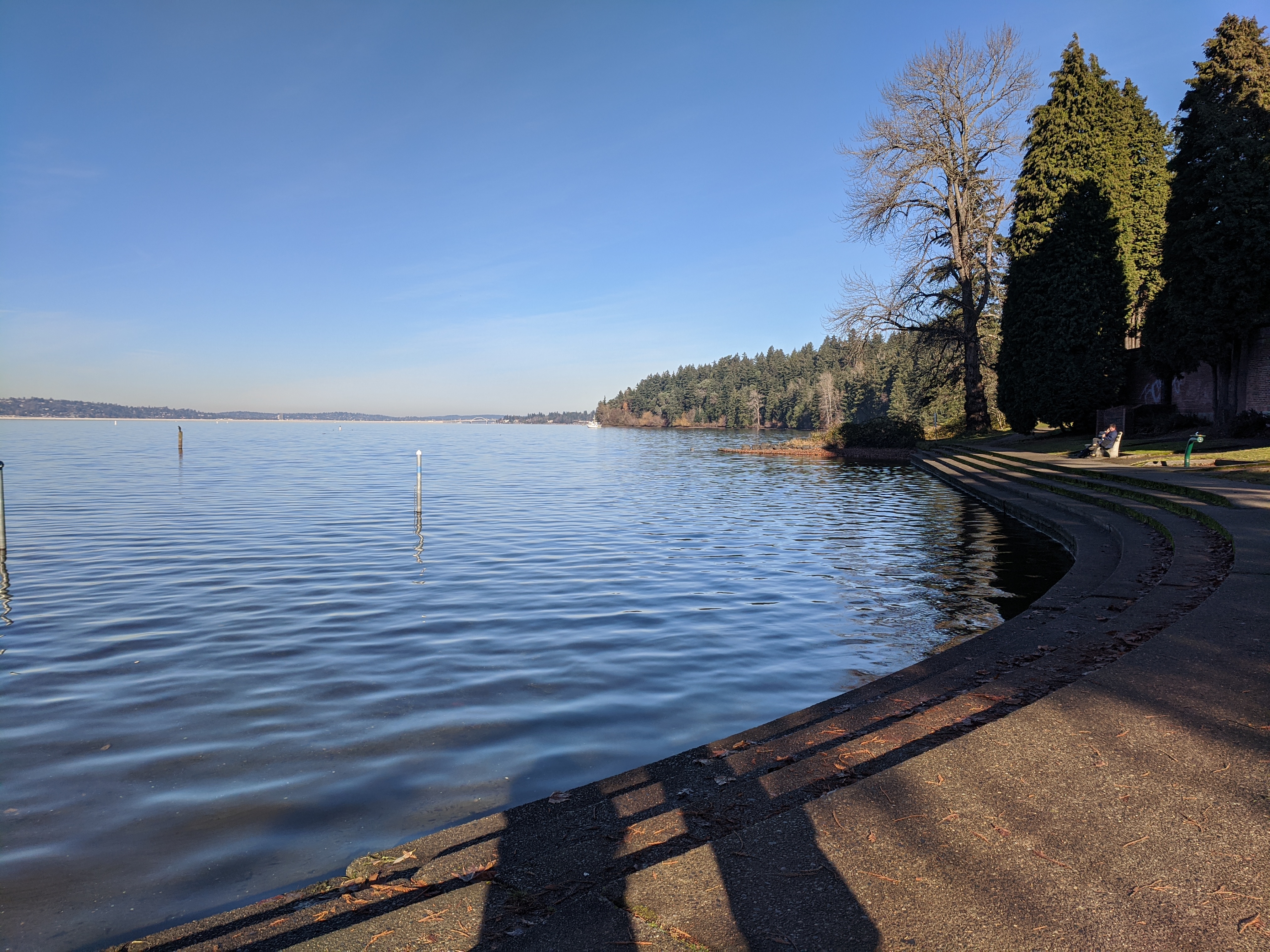 We headed down the hill to the park, which is a peninsula jutting out into mammoth Lake Washington, and were treated to the view below upon entering. We decided to follow the pathway leading north, not knowing where it would take us or what we'd see.